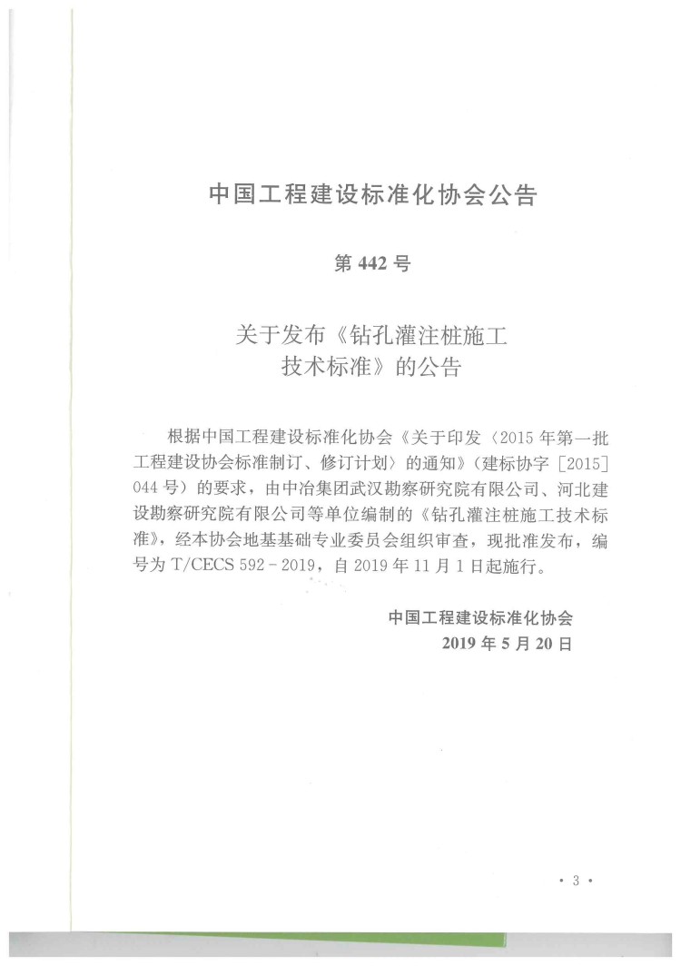近日,我公司主编的中国工程建设标准化协会标准《钻孔灌注桩施工技术标准》(T/CECS 592-2019)由中国建筑工业出版社正式出版发行,于2019年11月1日起实施。
