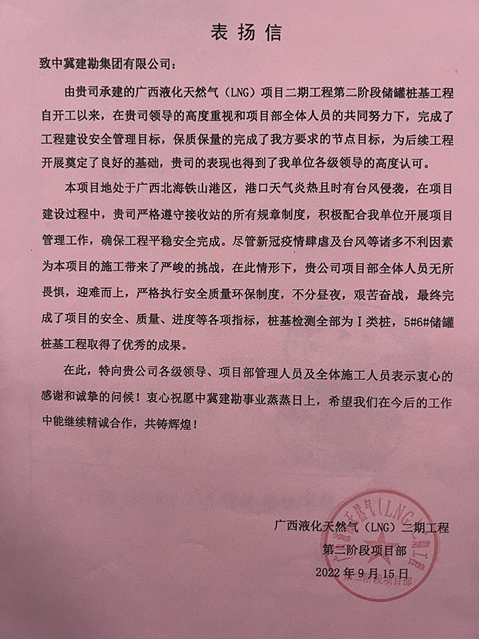 2022年12月30日我公司收到业主曹妃甸新天液化天然气有限公司发来的表扬信。由我公司承建的唐山LNG项目接收站二阶段(9#、10#、15#、16#储罐)工程9#、15#储罐桩基工程,主要施工内容为736根桩径1.4m、桩长71m/74m混凝土灌注桩,本项目自2022年5月31日开工以来,在唐山LNG项目部精心管理、规范施工下,严把安全质量关,践行着安全质量零事故目标,于2022年7月21日顺利完成所有施工任务,赢得业主、监理及总包的一致认可。桩基检测完成后,9#储罐桩基检测I类桩率100%,15#储罐I类桩率99.5%,再创新高。在施工过程中,项目部全体成员面对恶劣天气的不利影响及新冠疫情肆虐的局面,迎难而上,精诚协作,砥砺前行,淋漓尽致地诠释了建勘人的铁军精神,为项目顺利完成奠定坚实基础。
